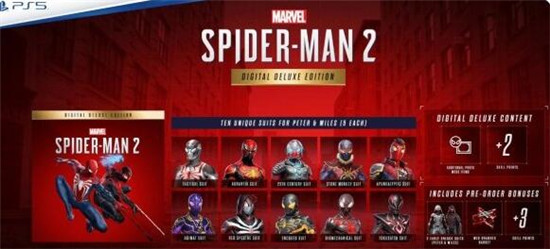 提供本体、上述全部预购奖励以及 10 套独特套装(彼得 5 套,迈尔斯 5 套)、额外的照片模式相框和贴纸,以及 2 个额外的技能点。
