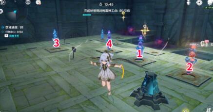 2.如图所示(序号为升级顺序),放置两水两雷一火,纳西妲站在雷塔中间,给出的怪拍照补草元素即可。