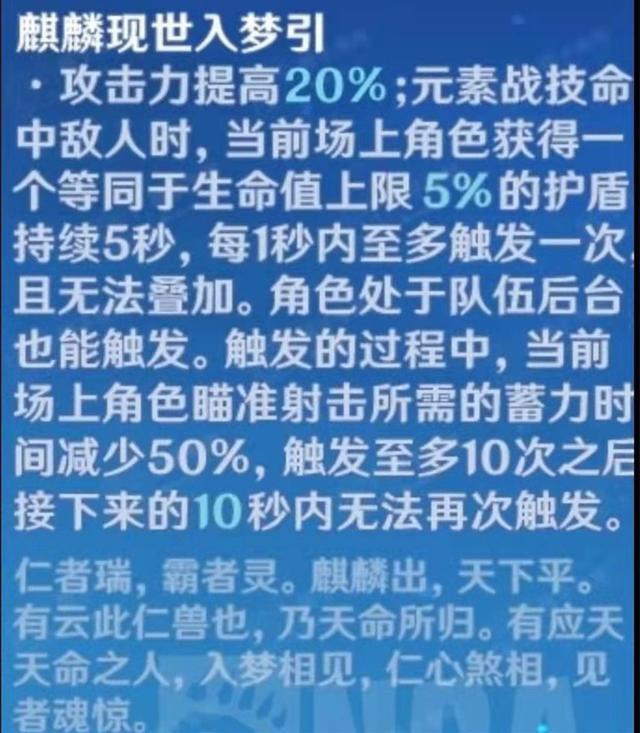 武器特效:看特效名字以及下面的小故事怎么都觉得这应该是甘雨的,看完具体效果,还真是有益于甘雨,只是换了个途径,让装备麒麟弓的角色在后台时,给甘雨加盾,给甘雨减蓄力射击时间。