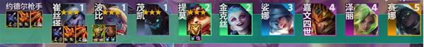 1:阵容由,小炮,波比,大树,提莫,金克丝,琴女,皇子,泽丽,赛娜组成的;