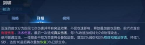 其普攻能连续打出不受攻速影响的四段7次伤害,包含了AD、AP和真实伤害,虽说普攻不吃攻速,但额外每1%攻速加成可转化为两点AD加成。不仅如此,亚连的普攻和1技能命中敌人,还会叠加百分比减伤、物穿和法穿效果,叠满16层可以回复3%已损生命值。由被动可以看出亚连是一位依赖普攻打伤害的英雄,需要近身格斗消耗。