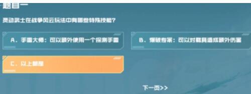 cf手游战垒驾照考试第一题答案是什么?今天小编想和大家聊一聊童年这款经典的枪战游戏——CF手游。它当中的每一位角色都设计得很逼真帅,每一位角色都有自身的特点,玩家爱根据自己的需求来选择,再给他配上火力够猛的枪支弹药,在战场中尽量击杀更多的敌人,并且保证自己阵亡的次数越少,才能在游戏结束时获得更高的名次。在最近CF又推出了新一轮的活动——战争风云,其中有一到叫做战垒驾照考试,有些小伙伴可能呗第一题就难倒了,那么大家可以多看看小编带来的具体详情,小编会将“灵动武士在战争风云玩法种有哪些特殊技能”这道题目中的答案分享在下面,各位小伙伴赶紧多了解一下吧。