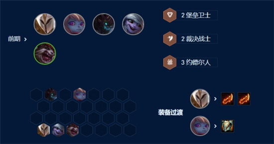 针对1费、2费卡为主C的阵容。2阶段可不升级。前期只拿目标英雄,可以考虑打连败,在3-1四人口冲刺D牌,将所有体系卡搜到2星及以上。1费卡核心阵容,且来牌较顺则可以把钱花完搜卡。之后稳血养经济,使用利息搜其他牌三星或者升人口补充更多羁绊和英雄。