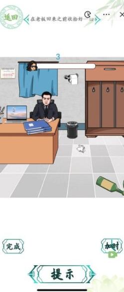 汉字找茬王老板出差怎么过?喜欢玩益智休闲小游戏的玩家不妨看看这款汉字找茬王,它与别的益智闯关游戏不同之处在于,他是需要通过文字来解答其中的谜题,在关卡中找出通关所需要的物件或者细节,才能顺利通往下一关。汉字找茬王老板出差是最近刚出的比较有趣的一关,在这一关中玩家需要在老板回来之前,把家里一切的杂物都收拾好。大家需要在规定的时间内完成任务,时间只有60秒,一定不要超过哦。想要了解老板出差通关的方法可以多看看下面的攻略,小编会把过关的答案分享在下面,快来一起看看吧。
