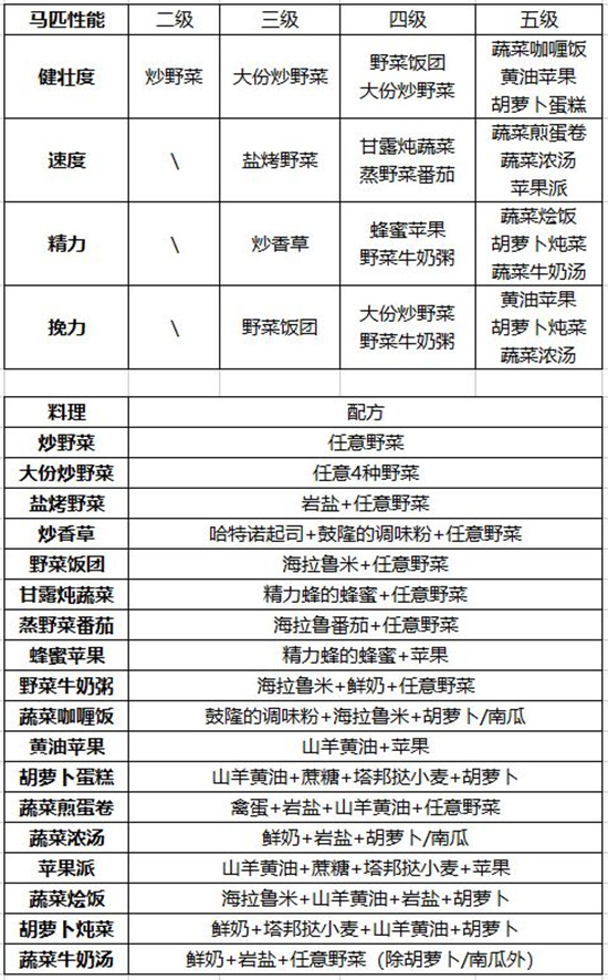另外升二级三级的料理只需一份,升四级五级的料理需要三份,所以想抓升到全五级的马,比起初始属性为四四四四或者四四五三,五五二四是更经济的选择。