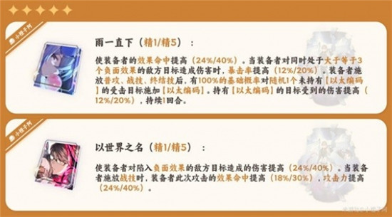 作为虚无中少有的辅助类型光锥,叠到满层可达到100%基础概率挂【攻陷】debuff。即面对20%、30%、40%效果抵抗的敌人,分别需要25%、43%、67%的效果命中,与终结技、行迹【惩戒】相同。
