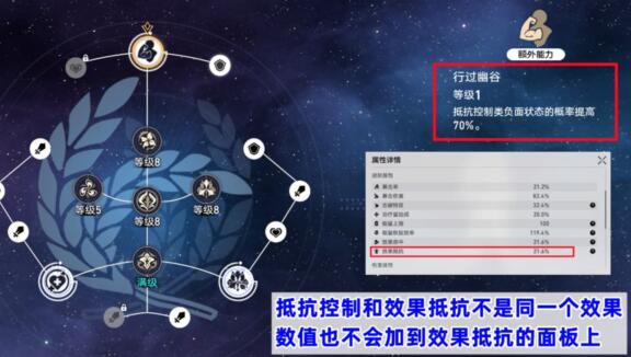 行迹方面,三个额外能力推荐尽早点亮,因为都和罗刹的辅助功能相关。需要注意的是,令罗刹抵抗控制类负面状态概率提升70%的额外能力,和效果抵抗不是同一种效果,70%的数值也不会计入面板。