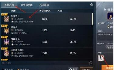 在兵团列表下,点击推荐兵团,选择一个喜欢的兵团,选择后,点击申请加入,如下图所示。