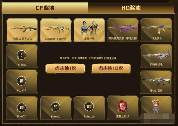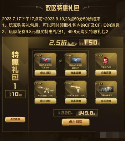 1,购买双区特惠礼包,例如49.8元买CF游戏内抽奖红宝石*5(或蓝宝石*5)+10个王者之石+CFHD礼包